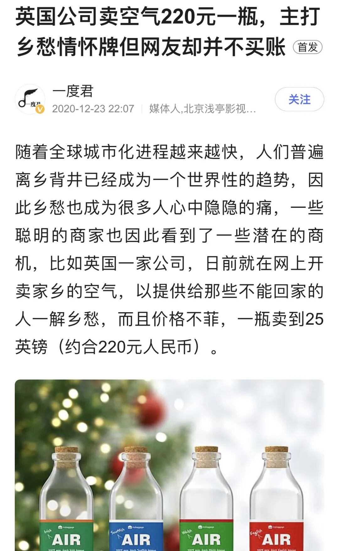 花大价钱体验空气,鸭鸭上次看到这事,还是某外媒报道一家英国公司卖“家乡”的瓶装空气: