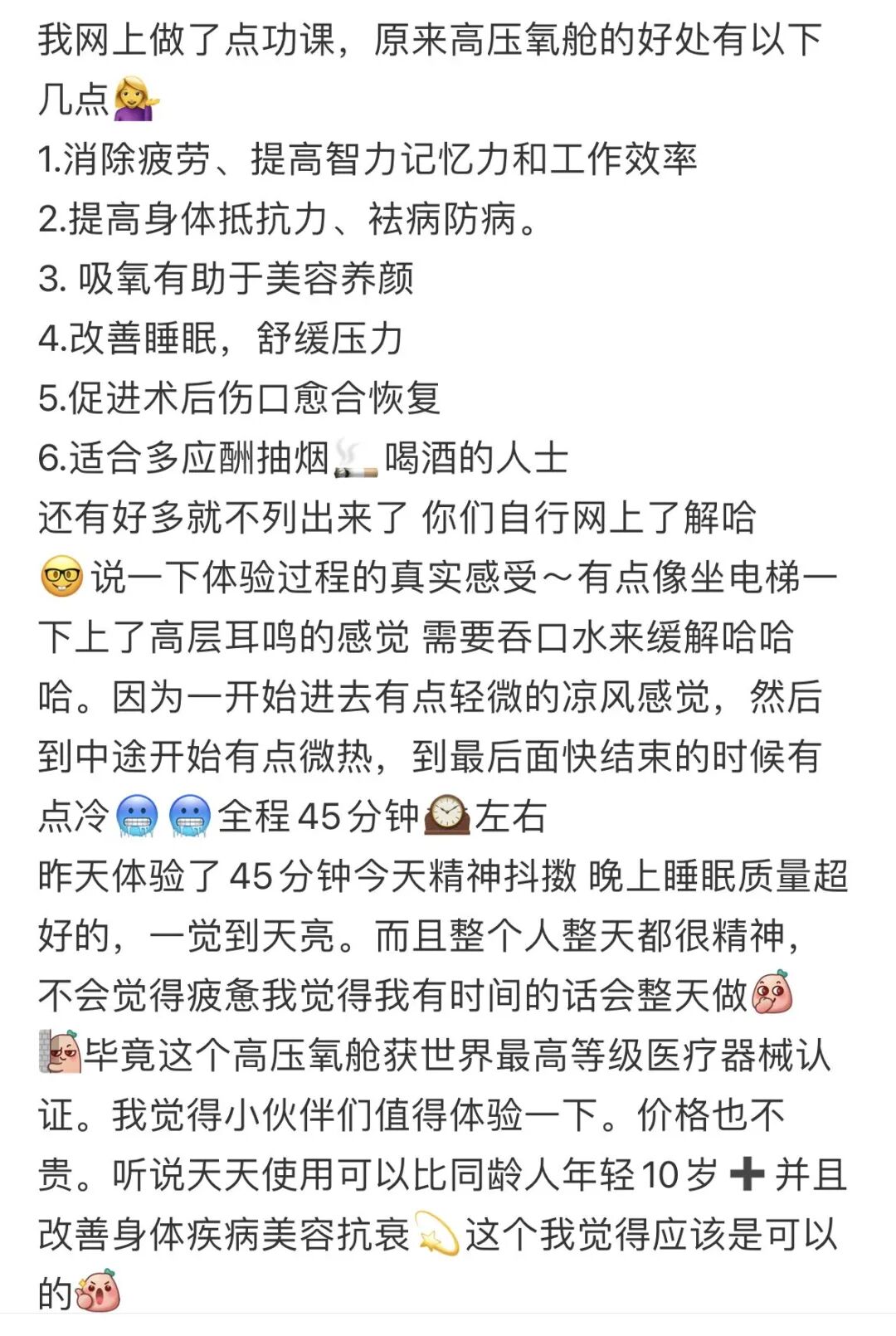 至于那些民用高压氧舱所宣传的其它功效,鸭鸭暂时无法考证,社交平台上也有一些素人博主分享经验,大家权当一看:
