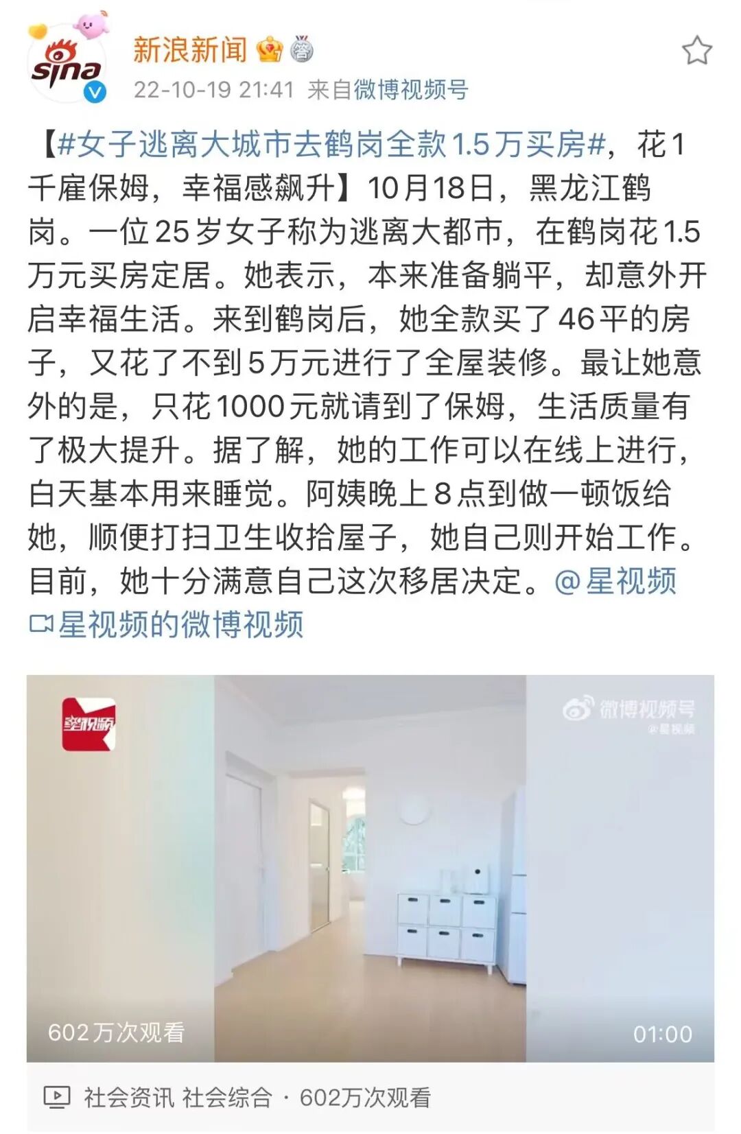 昨天鸭鸭还看到鹤岗1.5万一套房的新闻上了热搜来着: