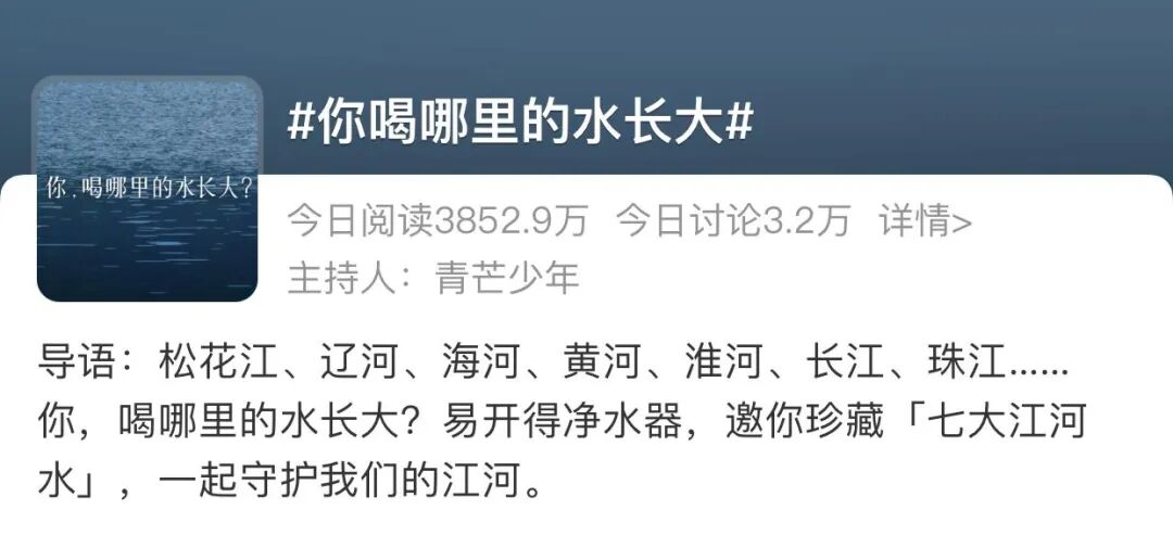原来发起#你喝哪里的水长大#微博话题的人,是中国(国家)南极科考队选用净水品牌易开得。易开得旗下拥有多款家⽤净水产品,在净水方面他们的经验和技术非常足。