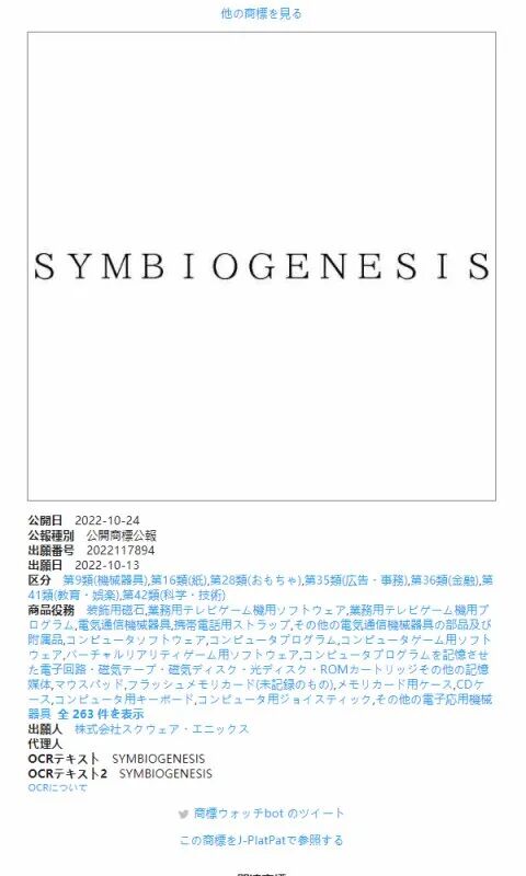 根据外网The Gamer的消息,史克威尔艾尼克斯注册了一个新的商标“Symbiogenesis”(共生体)。