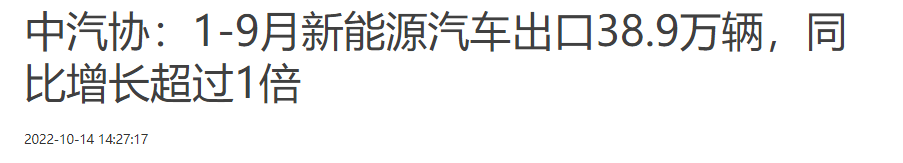 首先,我们从最新的中国汽车工业协会的数据显示来看,今年1-9月, 新能源汽车出口38.9万辆,同比增长超1倍,占总出口量的18.4%。