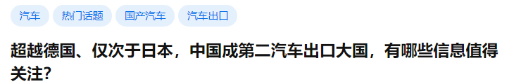 最近在网上冲浪的鸭鸭,发现知乎上有关“超越德国、仅次于日本,中国成第二汽车出口大国,有哪些信息值得关注?”的热搜问答。
