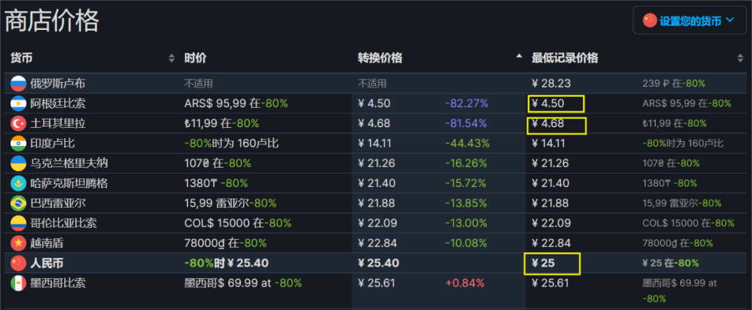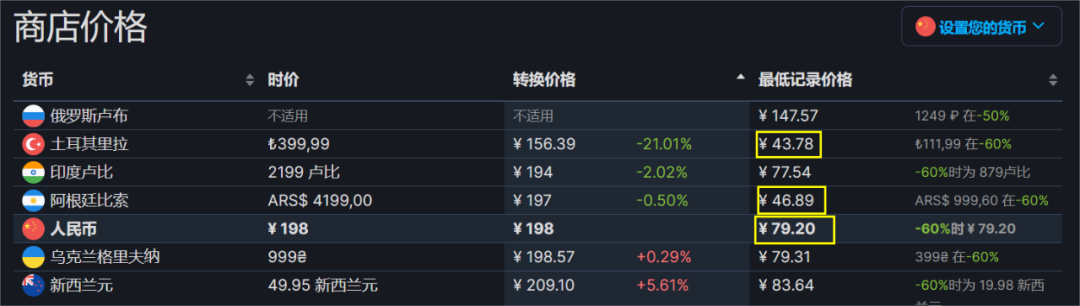 另外一个例子,自2015年发行以来一直好评如潮的游戏《巫师3:狂猎》,在Steam国区的最低价为25元,而在土耳其区、阿根廷区的最低价分别为4.68元、4.50元。