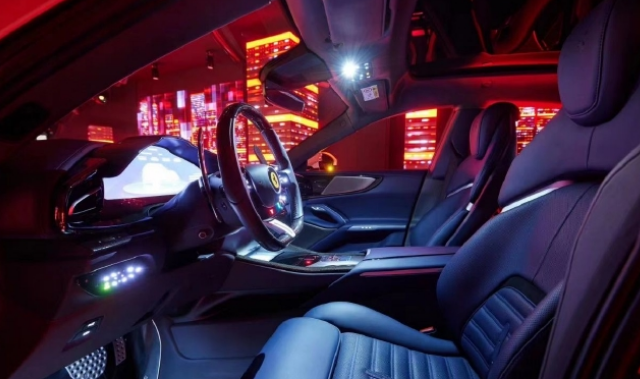 内饰方面,新车采用法拉利最新的数字化座舱理念,配有全液晶仪表以及三辐式多功能方向盘,更值得注意的是,新车在副驾驶前方也配备了一块液晶显示屏,显示内容包括车辆信息以及影音娱乐等。