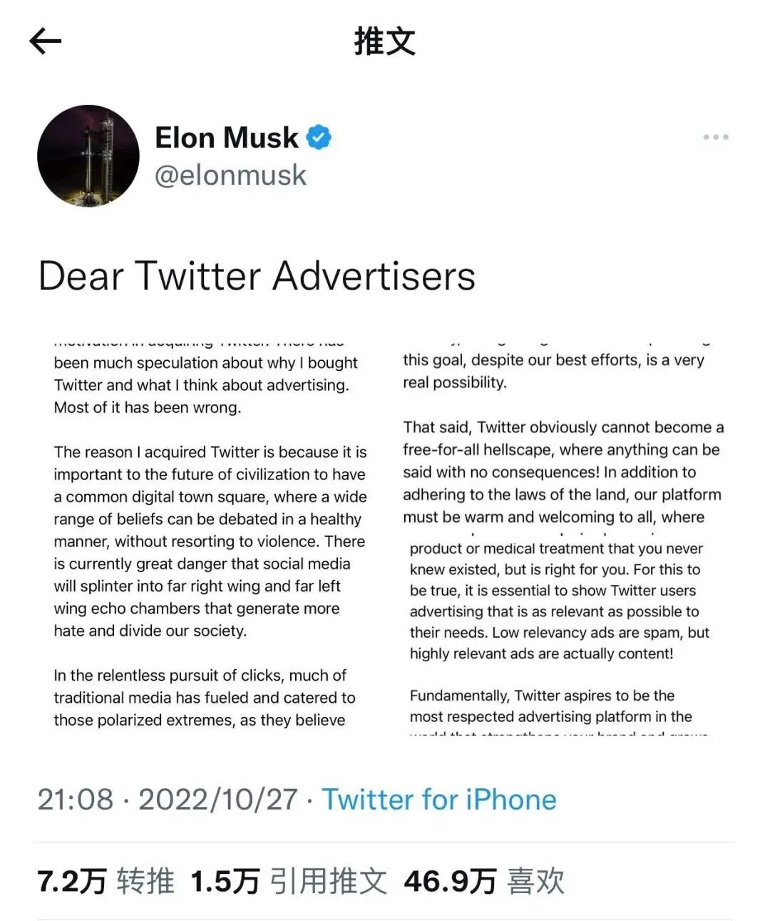 马斯克还发了一篇“致推特广告客户”的长文,解释了自己为什么要收购推特。