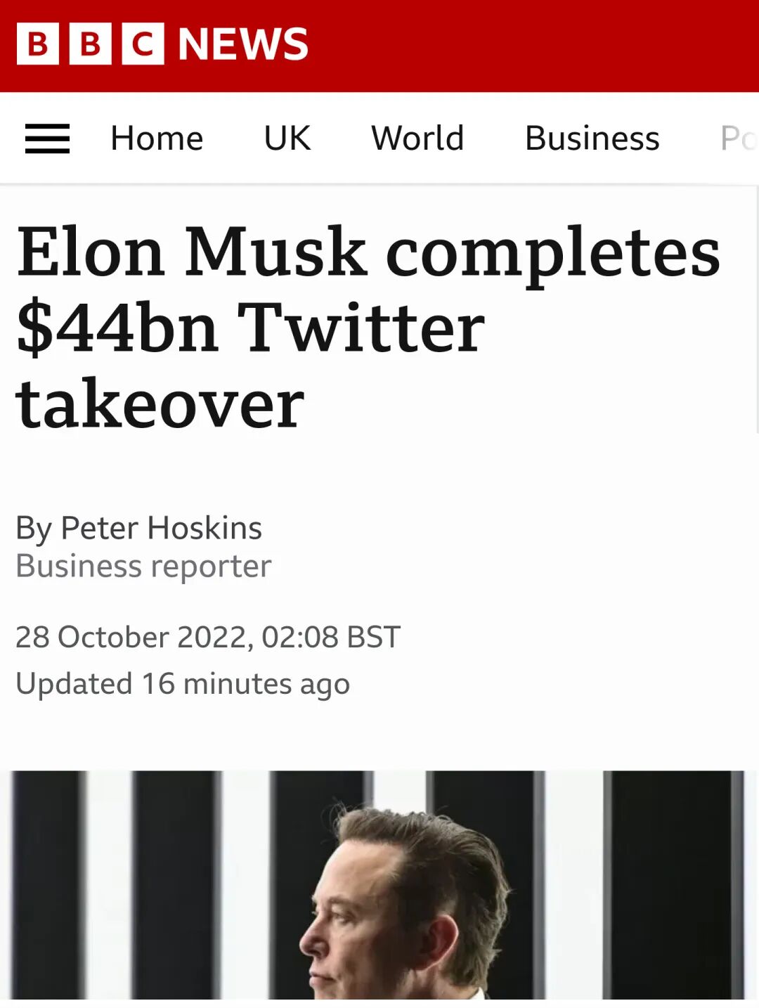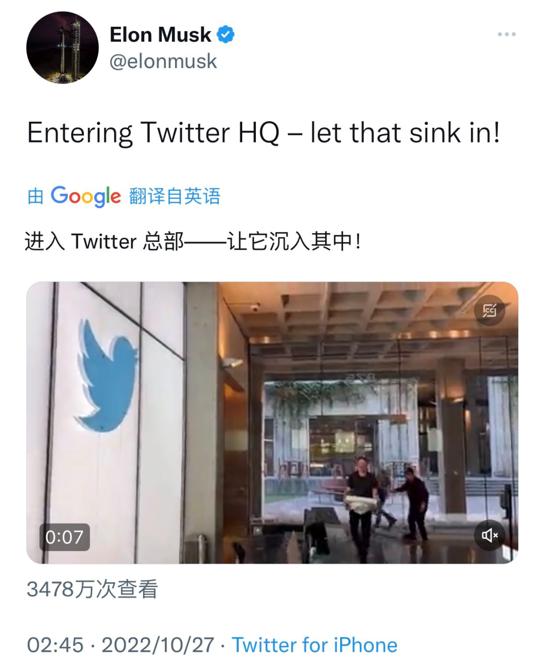 据外媒报道,当地时间10月27日晚,马斯克以440亿美元(约合人民币3178亿元)的价格正式收购推特,完成推特私有化交易。