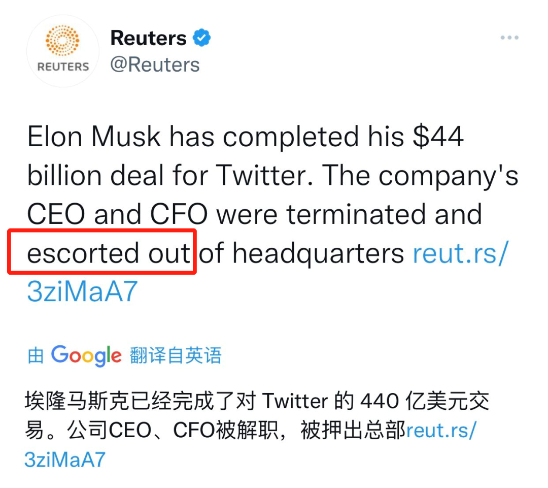 按照路透的说法,CEO和SFOB是被“护送”(escorted out)离开推特总部的。
