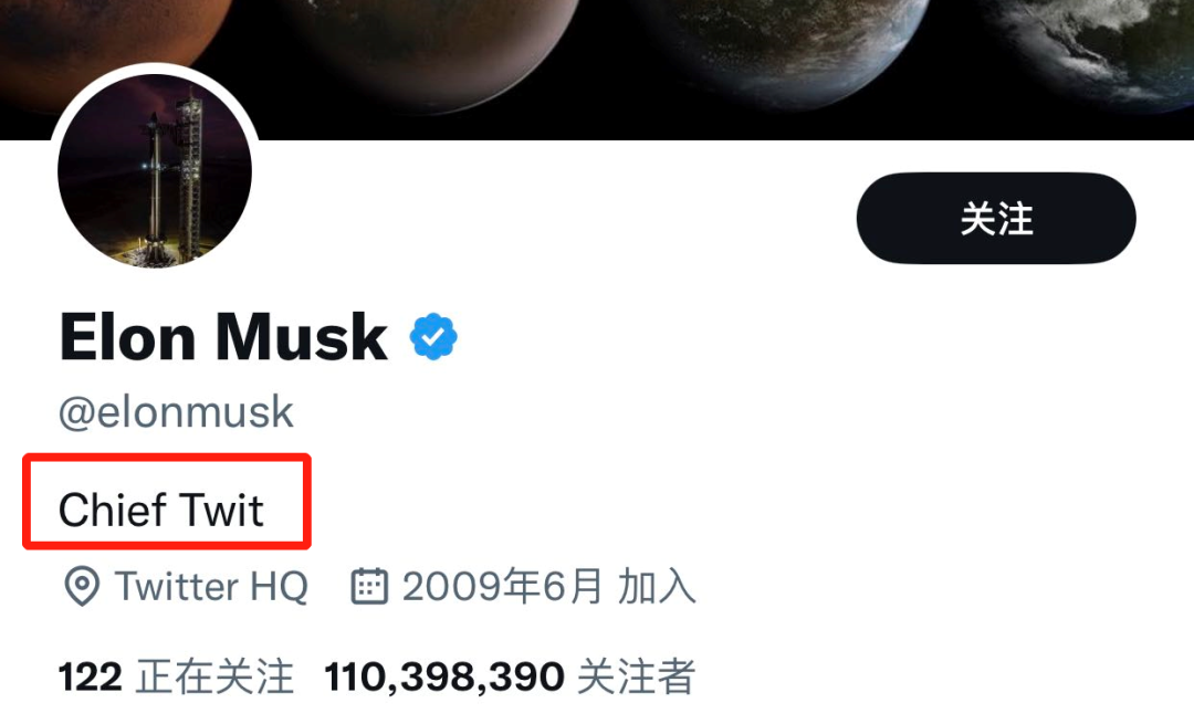 马斯克的推特简介已改为“推特老板”(Chief Twit)。