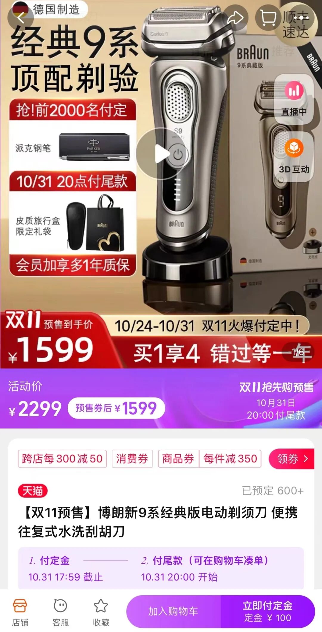型男必备,女生也可以买来送男友/老公的博朗新9系电动剃须刀,不仅有活动价,还支持24期免息,算下来一期70块不到~