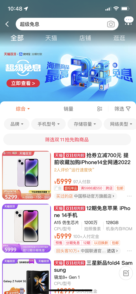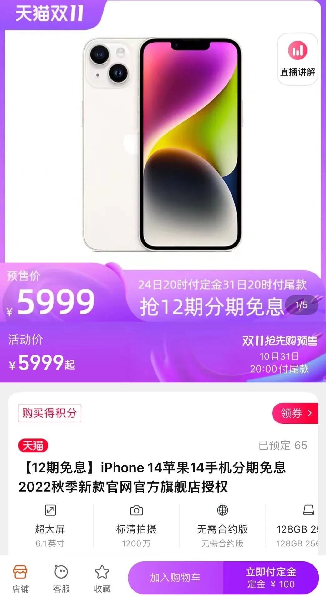 苹果用户如果想换新机,安卓用户如果想尝试下最新的iOS系统,iPhone 14应该都算一个不错的购买对象。而且这段时间赶上双11,上天猫用支付宝绑定信用卡可以分期免息购买,还挺划算。