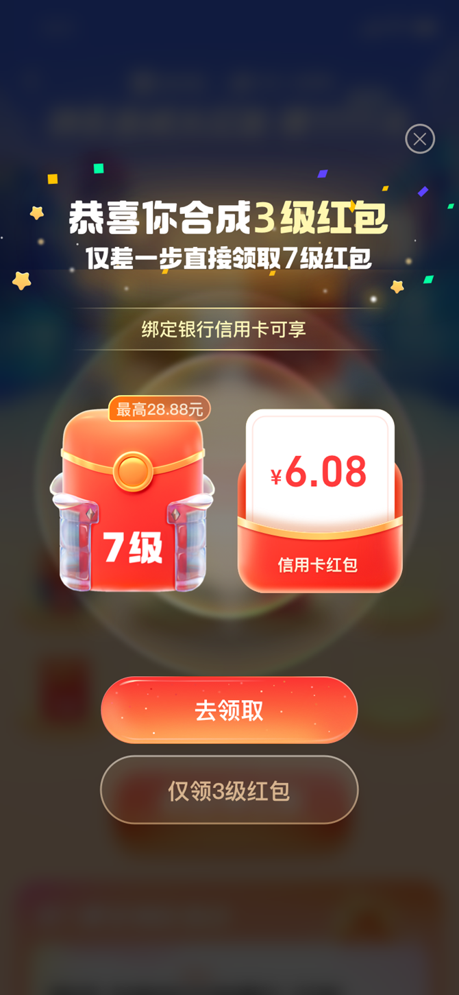 除了在支付宝绑定信用卡,享受下单分期免息的福利之外,大家现在上支付宝搜索关键词【超级大红包】,参与“快乐合成大红包”活动,还有机会赢最高1111元信用卡支付红包。