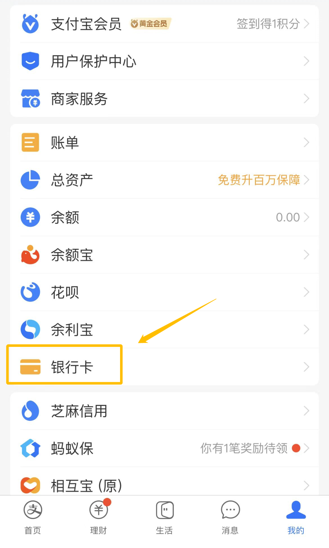 在支付宝【我的】界面,点击【银行卡】,选择【绑卡领红包】