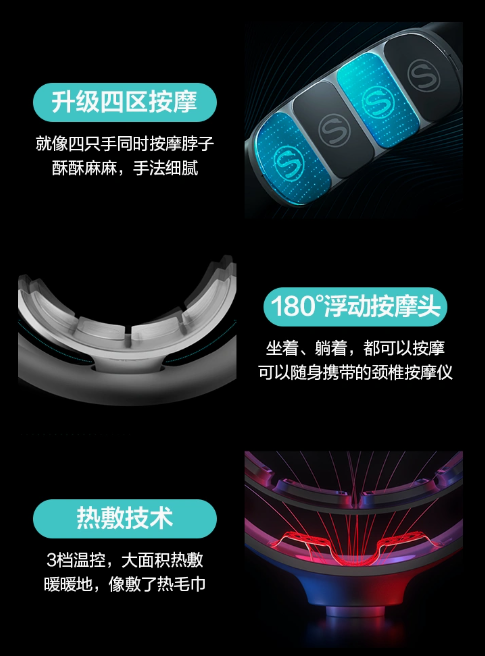 SKG颈椎按摩仪K5搭载了4区电级,采用双脉冲按摩技术,并且支持180度自适应按摩和3档速热热敷。