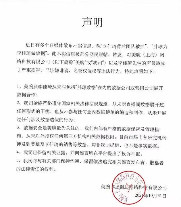 但是,警方的通报最早是10月16日发布的,而李佳琦在100多亿则是在10月20日卖的。难不成,“胖球数据”团队是在看守所里帮李佳琦做的数据?