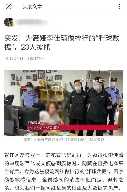 “为薇娅李佳琦做排行的‘胖球数据’,23人被抓!”