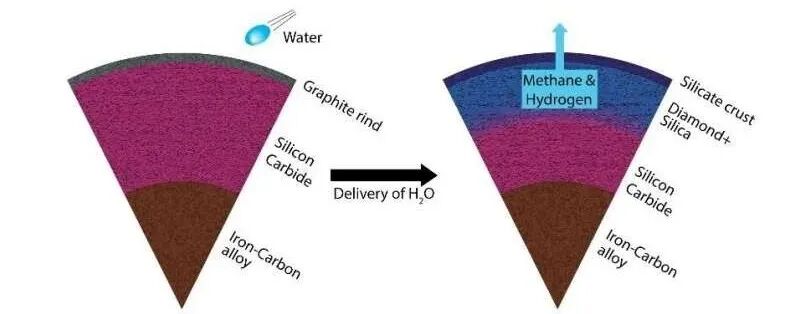 富碳行星的碳化硅幔(左),在水的参与和高温高压环境中,逐渐转化为二氧化硅和钻石幔(右)。反应同时还会产生甲烷和氢。Harrison / ASU