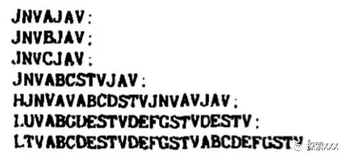 这篇文章的作者是我们前面提到的坎佩尔博士。在这篇文章中,他给出了一个破译信息的例子,使用的是31条从外层空间获得的信号(也许是模拟外星信号,仅作为练习使用)。这些信息的最原始形态是一些不连续的电信号。因此第一步是将这些信号根据断点分割,分割点用一个点表示。然后每段连续的电文,用字母标记不同类型的信号。
