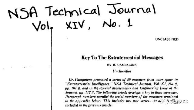 2011年4月21日,美国国家安全局在他们的技术期刊上发布了一些关于外星信息的文章。文章标题中“外星”这个词,使得很多人认为这是讨论破译收到的外星信号的。但实际上内容是关于“练习破译”外星人编码信息的,可以说是对以后与外星文明首次接触的一种演习。