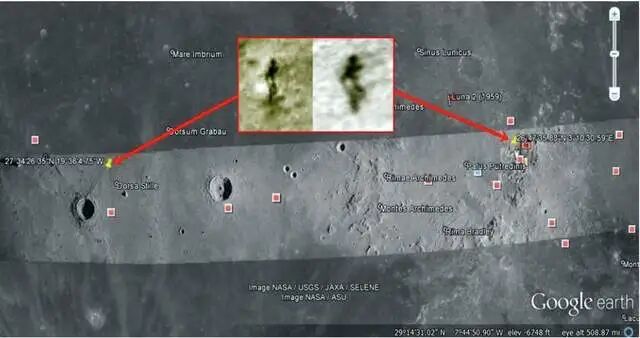 Google Moon 上线以后,总有网友发现其提供的月球照片中的形状异常的物品,其中最有意思的是两个人影。