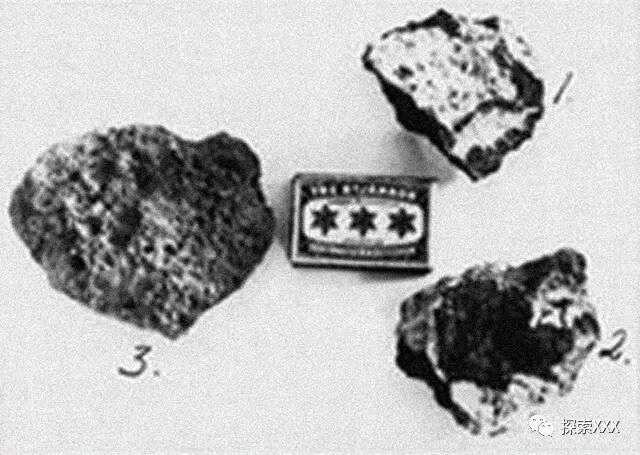 在纽伦达海滩发现的残片,中间是火柴盒,但最终被认定是木炭