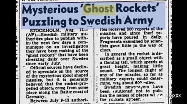 1984年,一个尘封了近40年的瑞典官方档案被解密。档案中记录了1946年期间在瑞典发生的幽灵火箭现象,包括了1500多份目击报告。根据记录,幽灵火箭被描述为管状或纺锤形物体,在低空高速或者缓慢飞行,几乎没有声音,但往往发出光芒。