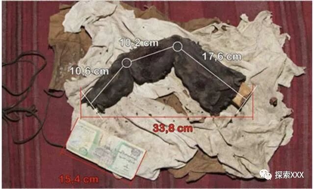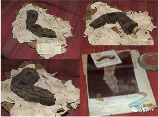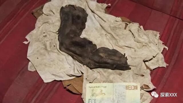 “在它旁边放了一张钞票,以便进行尺寸对比。弯曲的手指裂开了,上面长满了干霉。这出奇地轻,可能只有几百克。”