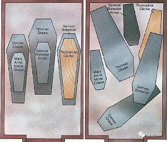 几年后,1816年,蔡斯家族需要再次打开了这座神秘的坟墓。这一次是为了埋葬小男孩查尔斯·布鲁斯特·埃姆斯。当墓穴被打开后,人们又一次被眼前的景象所震惊:所有的棺材都乱七八糟——就连托马斯·蔡斯那只又大又重的铅棺材也不例外。