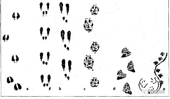 a:老鼠;b:水獭的后脚;c:獾的后脚;d:魔鬼足迹