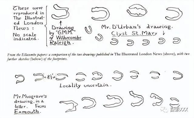 伍尔默的《埃克塞特和普利茅斯公报》上有一封信说:“穷人充满迷信,认为这简直就是老撒旦或他的一些小鬼的造访。”《西部时报》报道说,埃克斯茅斯“陷入了恐慌状态,因为有报道说,镇上和附近地区夜里有一个人来过,此人正是撒旦陛下,而且他的脚印在雪地上清晰可见。”在德文郡牧师赫伯特·埃拉科姆牧师的文件上,目击者画了各种魔鬼脚印草图。