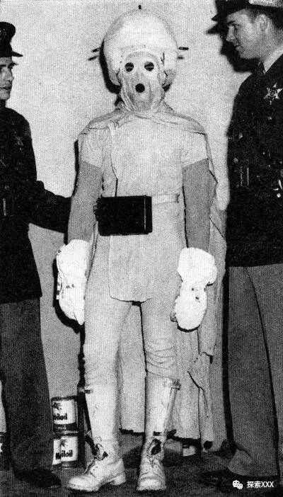 这个小人外表呈蓝色,被证明那是一种暗淡的蓝色辉光。尽管轮廓有点模糊,但目击者能辨认出一条线,不是头发的边缘,就是帽子的下沿,两只圆眼睛,一个看上去扁平的小三角形代替了鼻子,一件连体衣一直延伸到一条宽阔的黑腰带上,腰带前面装着一个大约15厘米见方的黑盒子。