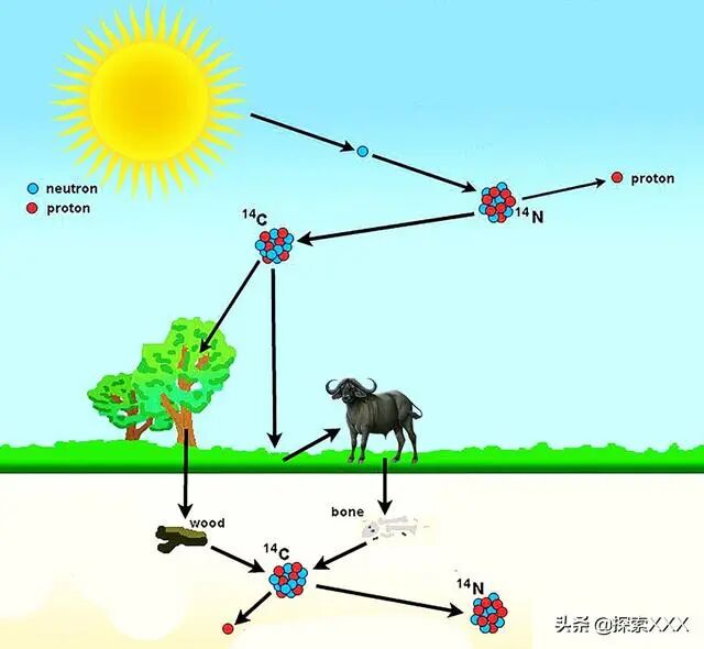 自然界中,碳元素除了碳-12和碳-13这两种稳定形态之外,还有第三种不稳定的形式,碳-14。碳-14是宇宙射线与大气中的氮相互作用产生的。它与大气中的氧气相互作用形成二氧化碳,在正常的光合作用过程中被动植物持续吸收,直到动植物死亡。由于碳-14随时间以稳定的速率衰减,植物或动物体内的碳-14量以固定速率缓慢减少。根据碳-14与碳-12和碳-13的比率可以估算出某些物体的年龄。