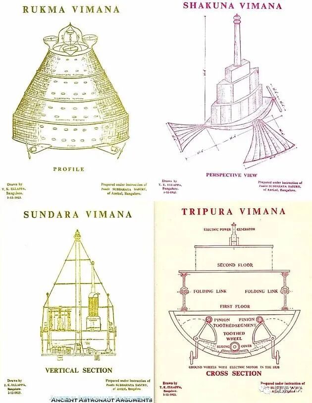 这些图纸中有专门用于运载易燃物和弹药的运输机,有载客400至500人的客机,还有拥有双层和三层甲板的飞行器。他对每种类型都有很详细的描述。这些资料来源于他收集的一些非常古老的手稿。他声称,这些手稿有几千年的历史,由古代的里希、巴拉德瓦、那拉达和其他人编纂。