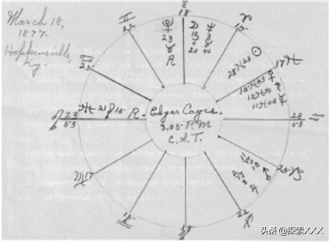 根据这些信息,亚当斯画了一张圆图,显示了凯西在1877年3月18日下午3点出生时的行星位置。凯西后来说,她告诉他的关于他的过去和未来的一切都是正确的,包括一些令他最不安的事情。他被告知,他在物质上永远不会快乐,也不会取得他认为最终会成为的那种成功。