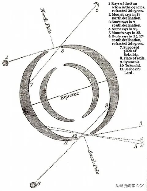 “北极的洞口直径大约是3000公里,而南极洞口稍微大一点。这些洞口相互平行,但与赤道成12度角,使北平面的最高点与南平面的最低点正对。”