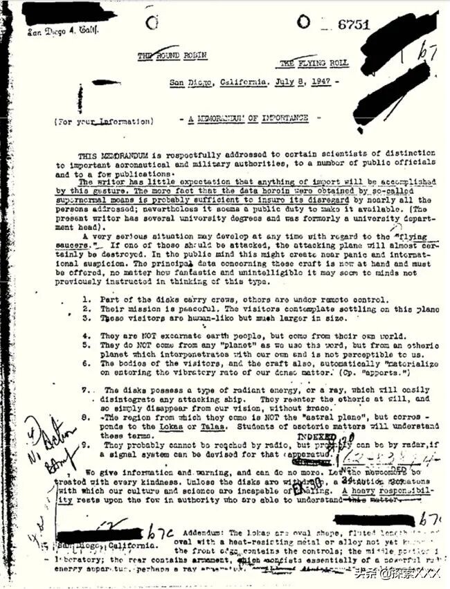 6751备忘录的日期是1947年7月8日,而直到63年后它才被公布于众。这份备忘录或许不是外星文明存在的确凿证据,但它的重要意义在于,它没有受到像诸如蓝皮书或红皮书等掩盖外星文明运动的影响,其记录的信息是十分可靠的。