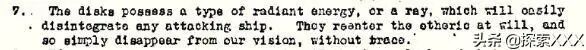这些圆盘具有某种辐射能或射线,可以很容易地使任何攻击舰分解。它们可以随意地重新进入以太,因此就从我们的视野中消失了,无影无踪。