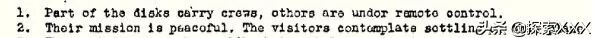 第一条指出当时出现的不明飞行物中,一些是载有外星生物的,而另一些则是远程遥控。由于文件的时间是1947年,因此可以看到这些是对1947年之前出现UFO目击事件的调查结果,可能包括著名的罗斯维尔事件。而无人驾驶的概念似乎在那个时候的外星飞行器中就已经开始使用了。