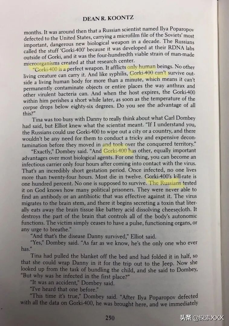 其实如果你查看这个小说的早期版本,你会发现一个截然不同的病毒:Gorki-400而不是Wuhan-400。Gorki是一个俄罗斯特征的地名,因此这个病毒在那时被认为和俄罗斯有关。在1989年,当《黑暗之眼》在冷战末期重新印制时,病毒的名称才改成了Wuhan-400。