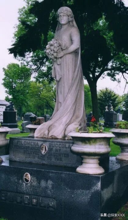 这位被称为“意大利新娘”的逝者的坟墓上有一个真人大小的穿着婚纱的女人的雕像,这是茱莉亚结婚照的石雕复制品,而在碑座上还镶嵌着两张照片。其中一张照片中,茱莉亚身着婚纱,面容安详地躺在棺木中。