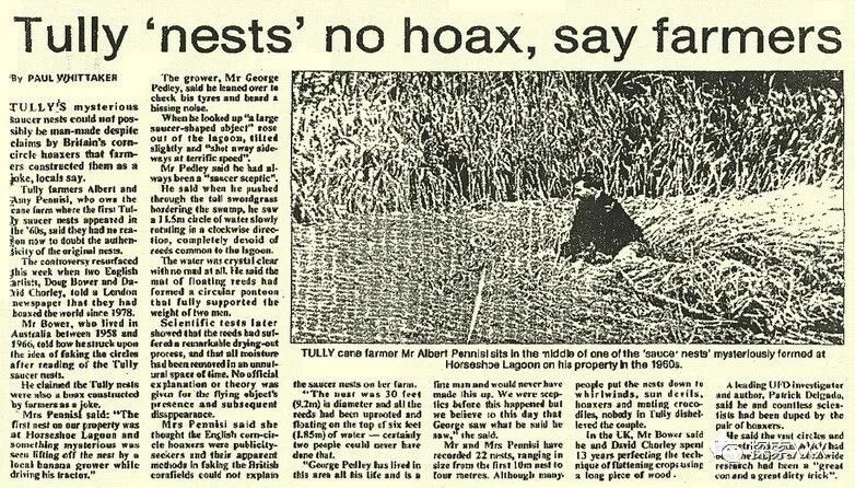 我们前面提到过1966年澳大利亚图利的芦苇丛曾出现过一个怪圈,这是由一位农场主乔治·佩德利(George Pedley)发现的。这个怪圈实际上牵扯到一个不明飞行物的目击事件,因此很多不明飞行物书籍都提到过这个事件。