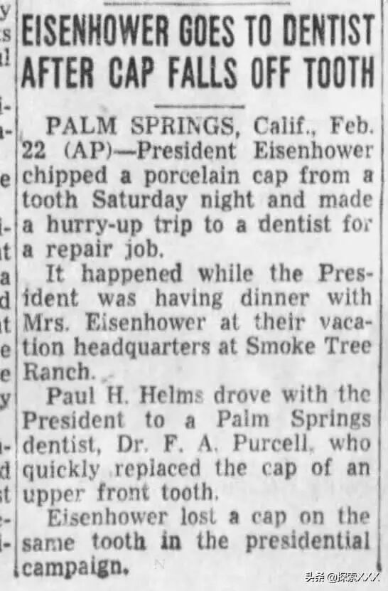 1954年2月20日至21日的晚上和凌晨时分,正在加州棕榈泉度假的德怀特·艾森豪威尔总统失踪了。第二天早上,当他出现在洛杉矶的一个教堂礼拜仪式上时,记者们被告知,他在前一天晚上必须接受紧急牙科治疗,并且已经拜访了当地的牙医。后来,这位牙医出现在当晚的一个活动上,自称为为艾森豪威尔治疗过的“牙医”。