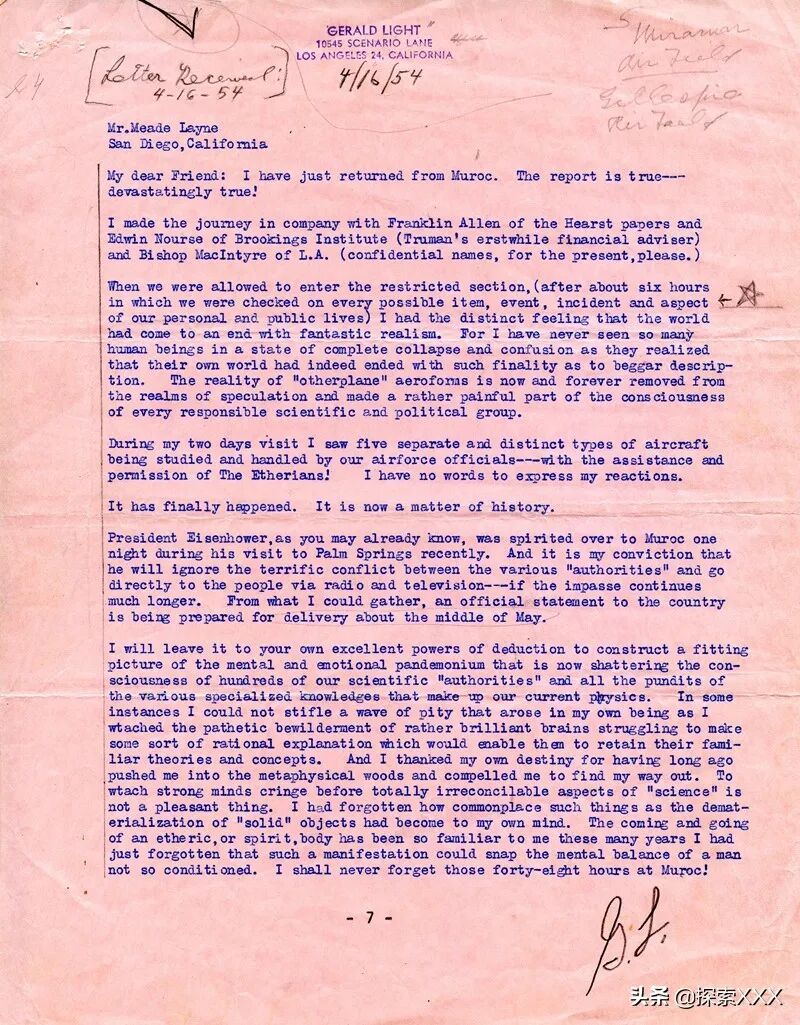 第一个公开宣称总统的这次失踪实际上是与外星人会面的人是杰拉尔德·莱特。他是一位美国神秘学家和飞碟爱好者,被人称为卡帕博士。在1954年4月16日,他给UFO学和超心理学的早期研究者,边境科学研究所的创始人兼第一任理事的米德·莱恩写了一封信。