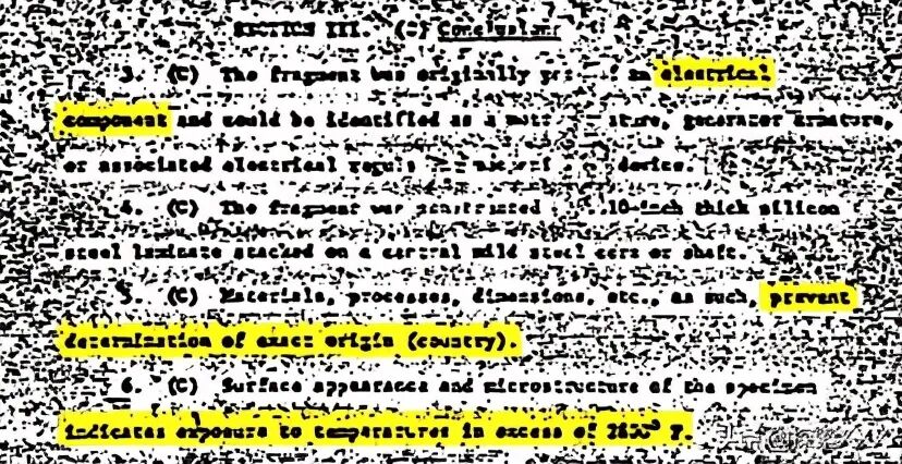 这份报告是通过美国《信息自由法》得以公开的。尽管这份公开的文件质量不高,可读性很差,但部分文字清楚地提到了分析这个不明物体碎片的事情。
