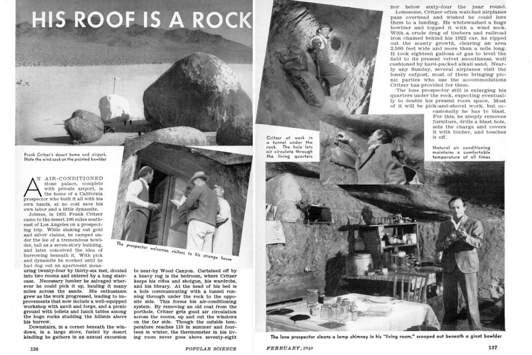 随后克里策尔开始在巨岩北侧建造一座24乘36英尺的地下住宅。整个住宅以手工凿石楼梯为特色,拥有通风的客厅、厨房和卧室。岩石悬挑下的窗户在白天可以为室内提供充足的光线,而一个集水系统则会收集落在岩石表面的降雨。