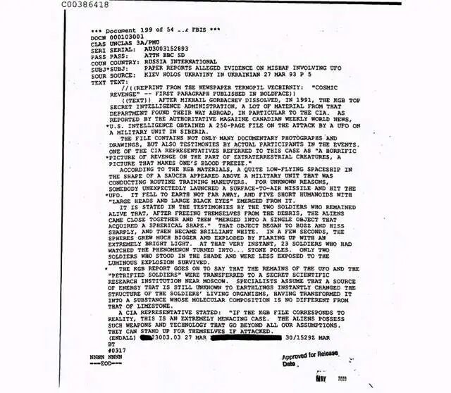 早在1993年,乌克兰一家未指明的报纸Ternopil就曾发表了一篇文章,称外星人袭击了西伯利亚一个军事基地,并提到了一份克格勃的文件。在这个厚达250页的文件中,包含了关于这一事件的记述以及阵亡士兵的照片和UFO本身的照片。