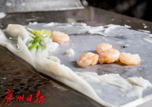 记者在现场看到,师傅快手将一块布铺在冒着重重蒸汽的蒸炉台上,刷几道油,再倒米浆,撒上用盐、糖、姜、陈皮腌制过的牛肉和葱,最后,以均匀力度将米浆朝“四面八方”推去,以保证受热均匀、拉肠够薄。蒸上几分钟后,肠粉与布融为一体,师傅一手抓着肠粉布,一手拿着刀往布上“刮粉”。