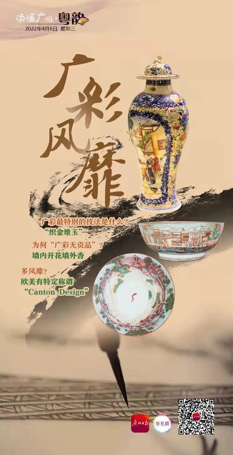 广彩是广州地区釉上彩瓷的简称,亦称“广东彩”,诞生于清康熙中期(十七世纪末),是中国工笔与西洋画法完美合璧的中国制瓷艺术,如今已被列入国家级“非遗”名录。