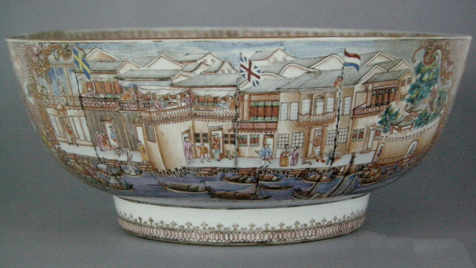 在琳琅满目的广彩制品中,有一类产品非常特别,称为“行碗”,现又称为“皮碗”,也有人以英文音译称其为“潘趣碗”。这是因为洋人常要求艺师在碗身画上他们与中国人做买卖的地方——十三行的景色,去满足国外消费者的好奇心。这种巨型大碗,有些直径甚至达50多厘米,胎薄釉润,图案繁复精美,是广彩外销瓷中的珍品。
