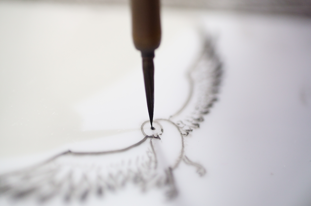 从业60余年的广东省工艺美术大师许恩福将圆瓷盘卡在枕箱(枕箱内装有彩绘工具,彩绘时可以用来承托执笔的手臂)的凹槽中,左手转动圆瓷盘,右手在枕箱上握笔,几秒钟就用毛笔画出均匀的圆弧线。
